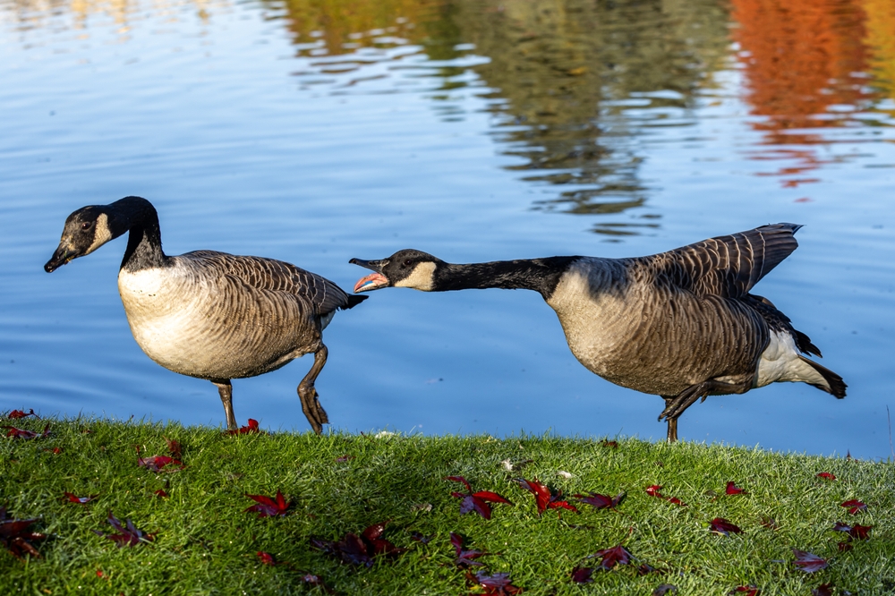 Geese are monogamous birds, meaning they will parent their goslings together, whether they stick around or decide to join a new flock. These birds have shared roles after their goslings imprint on each parent equally. The differences between each sex aren’t as noticeable during the winter. As the geese migrate and find a place to stay during the cold season, their behavior begins to focus on survival. Navigating migration, changing weather, freezing temperatures, and foraging for food all become the most important aspects of their lives. Together, they explore and create a new life until late spring. While in some ways the geese have their own roles, they do have behavioral overlaps. Both males and females become more aggressive during the breeding season. They seem to have short tempers and are willing to go out of their way in order to shut down any threats.